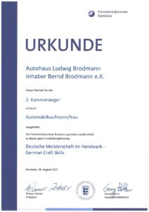 Ausbildungserfolg im August 2025: wir freuen uns über die Auszeichnung der Handwerkskammer Konstanz: einer unserer Auszubildenden wurde zum 2. Kammersieger im Beruf Automobilkaufmann/frau ausgezeichnet. Wir sind besonders stolz auf diese tolle Leistung unseres Auszubildenden und legen auch weiterhin einen großen Wert auf eine qualifizierte Ausbildung in unseren Berufen.